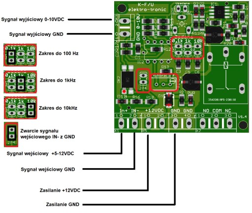 Na płytce znajduje się potencjometr (kalibracja F) za pomocą, którego możemy przeprowadzić kalibrację zakresu przetwarzania (układ jest wstępnie skalibrowany).
