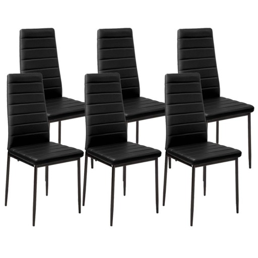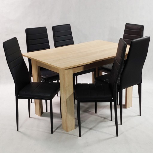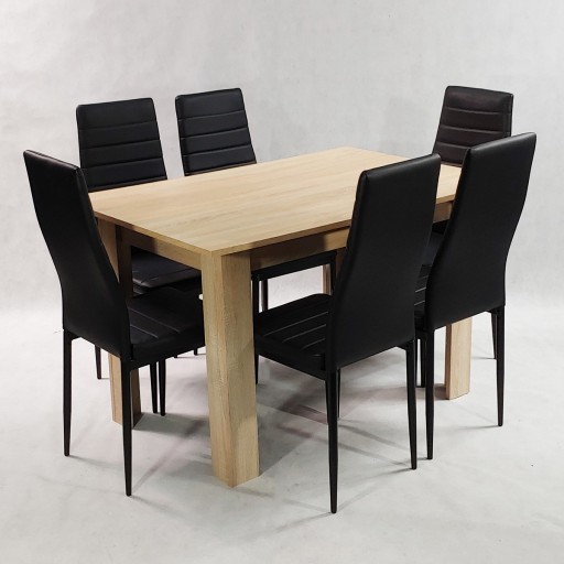 Wyjątkowo elegancki i niezwykle praktyczny zestaw stołowy sprawdzi się w klasycznych oraz nowoczesnych kuchniach lub jadalniach. Prostota wykonania to uniwersalna cecha, dzięki którym zestaw z powodzeniem sprawdzi się w różnych aranżacjach. Cechą wyróżniającą zestawu jest solidne i trwałe wykonanie. Zestaw składa się z prostokątnego stołu i 6 solidnych krzeseł. Stół wykonany jest z płyty laminowanej. W krzesłach zastosowano klasyczny stelaż wykonany z aluminium w kolorze czarnym, tapicerowany ekoskórą. Zestaw ten zwróci uwagę klientów ceniących uniwersalne i bardzo funkcjonalne rozwiązania.