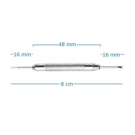 Takie urządzenie pozwala w prosty, a co najważniejsze bezpieczny dla zegarka czy smartwatcha, sposób zmienić pasek. Ma dwie końcówki - jedna "szpikulec", która wykorzystana może zostać np. do regulacji zapięć przy bransoletach posiadających mikroregulację lub do wypychania teleskopów w modelach posiadających przelotowe otwory. Druga końcówka, ta zakończona ząbkami, jest specjalnie wyprofilowana i ułatwia ona przytrzymanie końcówki teleskopu przy wymianie paska lub bransoletki.