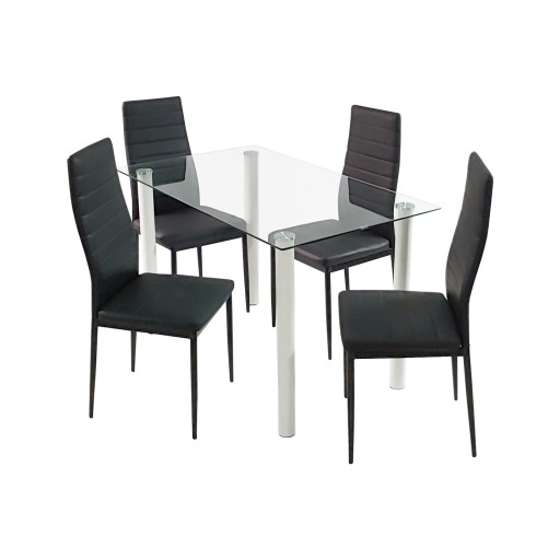 Wyjątkowo elegancki i niezwykle praktyczny zestaw stołowy NICEA sprawdzi się w klasycznych oraz nowoczesnych kuchniach lub jadalniach. Okrągłe nogi, szklany blat, srebrne wykończenie stołu oraz tapicerowane krzesła to uniwersalne cechy, dzięki którym zestaw z powodzeniem sprawdzi się w różnych aranżacjach. Cechą wyróżniającą zestaw NICEA jest solidne i trwałe wykonanie. Zestaw składa się z prostokątnego stołu i 4 solidnych krzeseł. Stół wykonany jest z metalowych nóg oraz blatu z transparentnego szkła hartowanego. Krzesła, obite ekologiczną skórą, również wykonane są na stalowej ramie. Zestaw ten zwróci uwagę klientów ceniących uniwersalne i bardzo funkcjonalne rozwiązania.