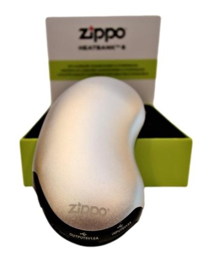 Powerbank marki Zippo w kolorze srebrnym z funkcją ogrzewania dłoni.