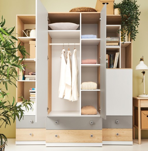 - PIXEL – PX 03 – 80x190x50 – szafa dwudrzwiowa z dwoma szufladami 4 półkami w węższej części oraz półka i drążkiem do zwieszenia ubrań za szerszymi drzwiami