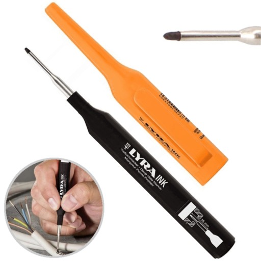 LYRA INK Znacznik głębokich otworów do wiercenia i trudno dostępnych otworów i obszarów Pisanie i znakowanie na powierzchniach - w stopniu bardzo dobrym na: kamieniu i betonie; - w stopniu dobrym na: drewnie suchym, metalu (nie gorącym) i plastiku; - w stopniu odpowiednim na płytkach ceramicznych i szkle; (bez możliwości usunięcia) Trwały tusz, szerokość linii 1mm, twardość 2B Maksymalna głębokość otworu 35mm, maksymalna średnica otworu 4,5mm