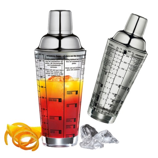 Na ściankach szklanki znajdują się miarki oraz przepisy po niemiecku i po angielsku do przygotowania sześciu popularnych drinków, takich jak