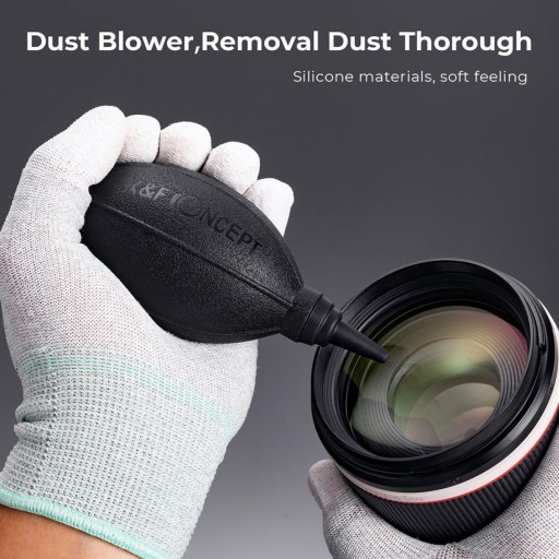 Duża czarna dmuchawa z łatwością usuwa kurz i zanieczyszczenia z matryc aparatów, obiektywów i filtrów za pomocą silnego podmuchu powietrza.