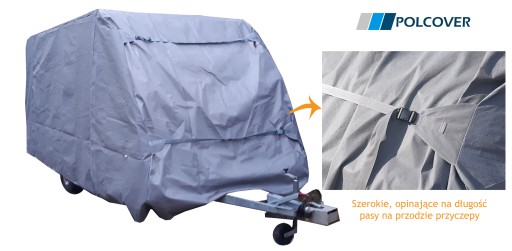 Z przodu pokrowca, nad dyszlem przyczepy, wszyte zostały dwa poziome pasy. Po ich zaciągnięciu pokrowiec opinany jest na długość i idealnie dopasowuje się do kształtów przyczepy. Zapewnia to nie tylko estetykę , ale przede wszystkim ogranicza ruch pokrowca na wietrze.