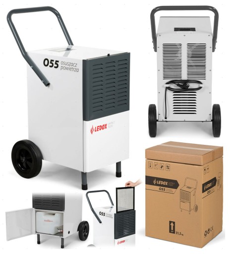 Osuszacz powietrza Ledox O55 to kondensacyjny osuszacz budowlany o szerokim zastosowaniu. Sprawdzi się w osuszaniu budynków podczas prac remontowych i konserwatorskich oraz w utrzymaniu odpowiedniej wilgotności powietrza w pomieszczeniach magazynowych, warsztatach czy archiwach. Urządzenie oferuje wysoką wydajność pracy na poziomie 55 litrów na dobę, a idealny zakres temperatur pracy osuszacza wynosi od ok. +5 oC do ok. +35 oC. W modelu Ledox O55 zastosowano automatyczne rozmrażanie, które uruchamia się w niskich temperaturach. W tym czasie wentylator pracuje prawidłowo, a sprężarka wyłącza się.