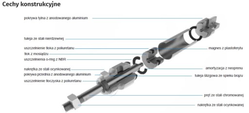 - Tłoczysko: stal węglowa chromowana CK45 dla średnicy tłoka D8-10 / stal nierdzewna AISI 303 dla średnicy tłoka D12-63