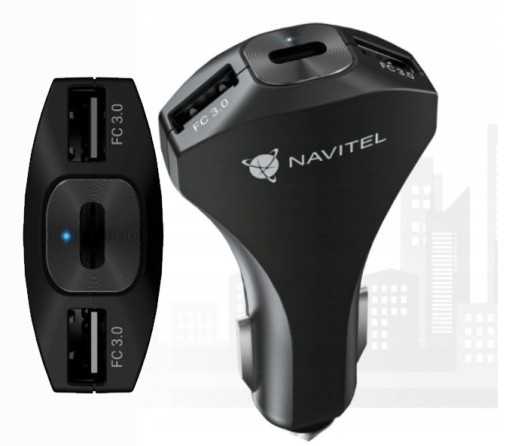 NAVITEL USP45 SLIM to uniwersalna ładowarka samochodowa z dwoma złączami szybkiego ładowania USB-A oraz złączem USB-C.