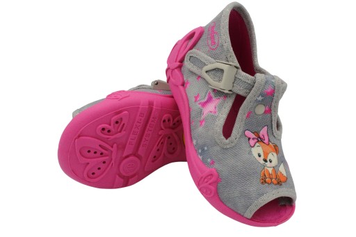 Cholewka ma kolor szary zaś wyściółka jest różowa. Na przodzie bucików możemy zobaczyć uroczego liska, z boku na cholewce widnieją gwiazdki.