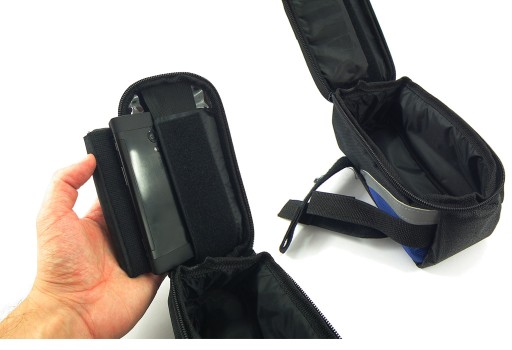 Torebka posiada również przeźroczystą kieszeń na telefon komórkowy, która mieści nawet największe smartfony (ekran maks. około 6,5 cala w zależności od proporcji ekranu). Dzięki takiemu rozwiązaniu możemy korzystać np. z nawigacji lub innych aplikacji treningowych podczas jazdy. Można również odbierać lub wybierać połączenia i rozmawiać przez głośnik w trybie głośnomówiącym. Dzięki specjalnej konstrukcji przeźroczysta folia pozwala na korzystanie z telefonów wyposażonych w ekran dotykowych, ponieważ reaguje na dotyk i aby obsłużyć telefon nie trzeba wyciągać go z etui. Jednocześnie jest to bardzo dobre zabezpieczenie telefonu przed uszkodzeniami mechanicznymi, kurzem i brudem podczas jazdy.