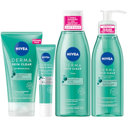 NIVEA® DERMA SKIN CLEAR Żel oczyszczający przeciw niedoskonałościom idealny dla cery skłonnej do niedoskonałości. Formuła z Kwasem Salicylowym i Niacynamidem intensywnie oczyszcza skórę i pory oraz skutecznie zwalcza niedoskonałości. Efektywnie usuwa nagromadzony w ciągu dnia oraz nocy nadmiar sebum. Butelka wykonana w 98% z plastiku z recyklingu (z wyłączeniem etykiety i pompki). Wegańska formuła, która nie zawiera składników pochodzenia zwierzęcego. Omijaj okolice oczu. Tolerancja i skuteczność dla skóry skłonnej do niedoskonałości przetestowana klinicznie.