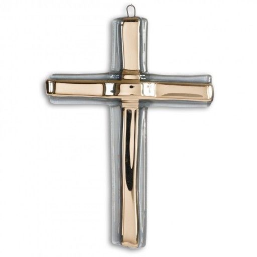 Ten luksusowy krzyż na ścianę jest wykonany z przezroczystego szarego szkła i ma ciekawy, warstwowy wygląd. Centralna część krzyża jest posrebrzana platyną.