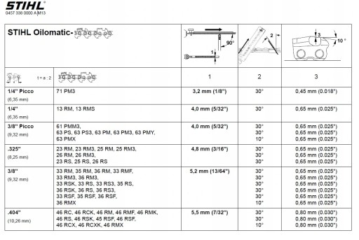 Do ustawiania odstępów ogranicznika zagłębienia, a także do wyrywkowej kontroli kąta zęba firma STIHL oferuje przymiar. Należy go dobrać odpowiednio do podziałki łańcucha, po czym będzie można przystąpić do sprawdzenia wszystkich wymaganych kątów i wymiarów. Przymiar znacznie ułatwia przede wszystkim prawidłowe sprawdzenie i piłowanie ograniczników zagłębienia.