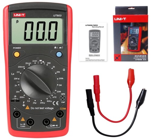 Multimetr cyfrowy elektroniczny UT603 - towar renomowanego producenta aparatury pomiarowej. Miernik umożliwiający pomiar parametrów rezystancji, pojemności oraz indukcyjności. UT600 służą do testowania rezystorów, kondensatorów i cewek. Mogą również służyć do pomiaru parametrów tranzystorów. Z serii mierników UT600 jest to topowy model o najlepszych parametrach.