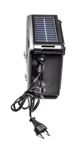 - W radiu znajdziemy 1x LED latarkę którą naładujemy tak jak radio poprzez panel słoneczny czy kabel ósemkę (dołączony do zestawu.