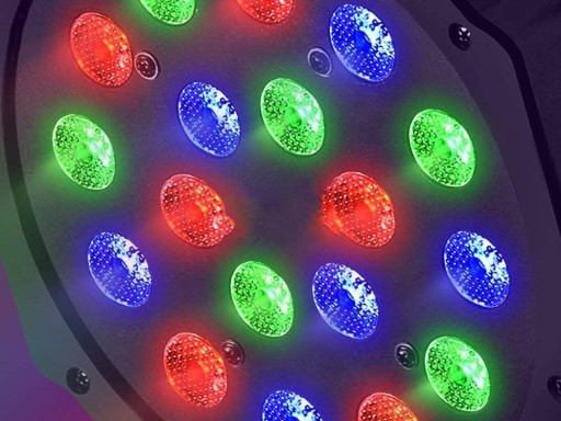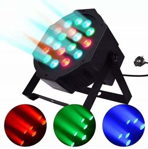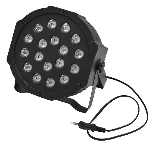 - Reflektor typu PAR, wyposażony w 18 soczewek, za którymi mieszczą się tworzące mocne i wyraziste barwy, 3-watowe diody LED pracujące w palecie kolorów RGB. Urządzenie posiada wbudowany panel kontrolny składający się z wyświetlacza LED oraz 4 przycisków. Za jego pomocą możemy wybrać jeden z czterech interesujących nas trybów pracy: