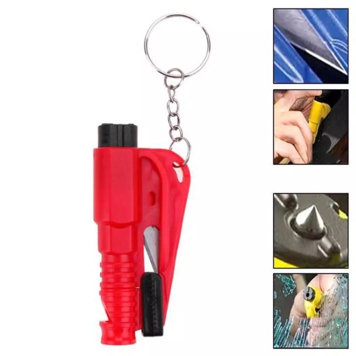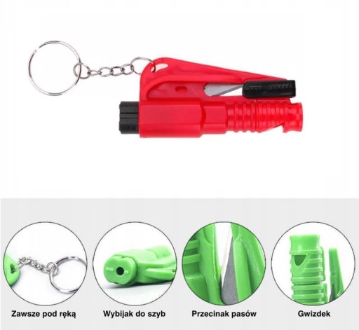 - Narzędzie 3w1 - młotek do rozbijania szyb (hartowanych, nielaminowanych), przecinak pasów bezpieczeństwa, breloczek do kluczyków samochodowych oraz gwizdek.