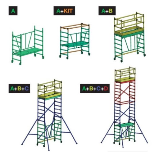 Wieża składa się z 5 modułów, pozwala to w bardzo krótkim czasie zmienić jej wysokość. Oferta dotyczy modułu A, o wysokości roboczej 2,6 m.