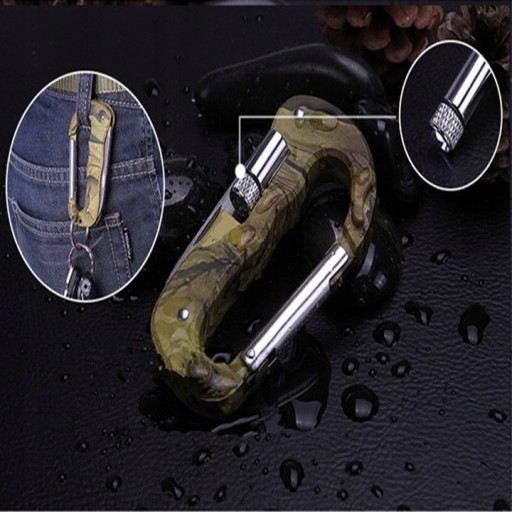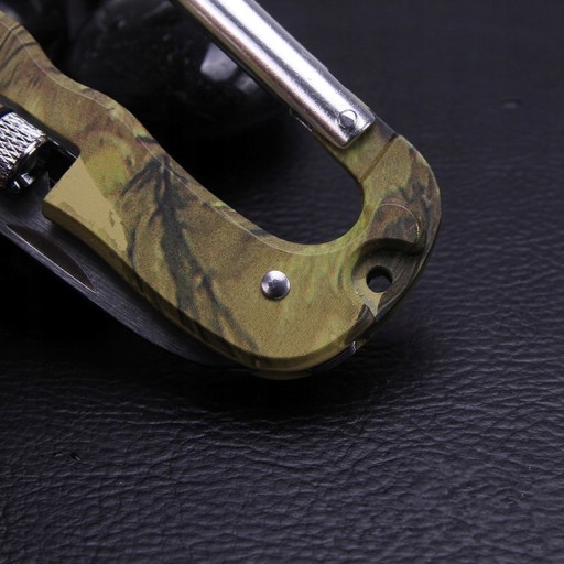 - Praktyczny scyzoryk turystyczny w kształcie karabińczyka z podwójnym ostrzem i mini latarką.