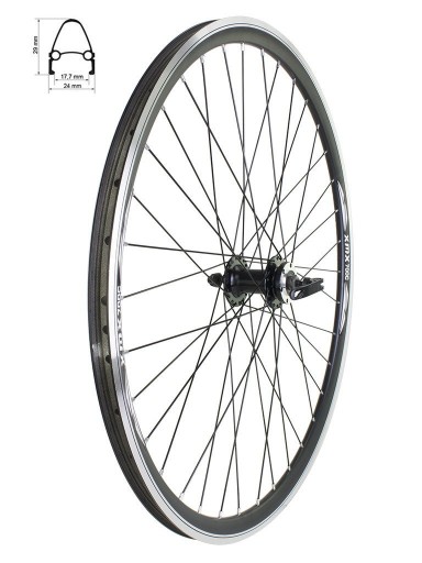 Koło przód 28" piasta na łożyskach maszynowych SF-B07 QR czarna pod hamulec tarczowy na 6 śrub, obręcz stożek, szprychy czarne
