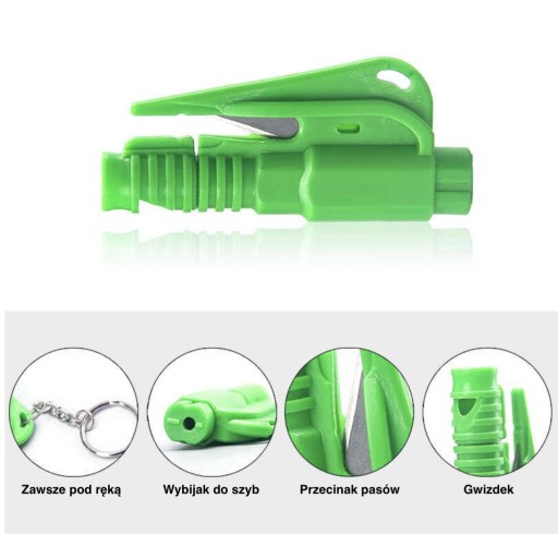 - Narzędzie 3w1 - młotek do rozbijania szyb (hartowanych, nielaminowanych), przecinak pasów bezpieczeństwa, breloczek do kluczyków samochodowych oraz gwizdek.