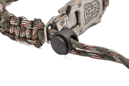 - Zapięcie stanowi metalowa klamra wyposażona w miniaturowy nożyk, na ręce jako bransoletka jest schowany ale gdy się zapnie odwrotnie nożyk do klamry stanowi bardzo poręczny nóż.