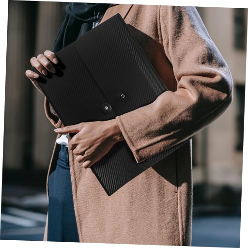 - Bezpieczeństwo Dokumentów: Wodoodporna konstrukcja chroni zawartość przed wilgocią i brudem, a zakładka z elastycznym zamknięciem zabezpiecza dokumenty przed wypadnięciem.