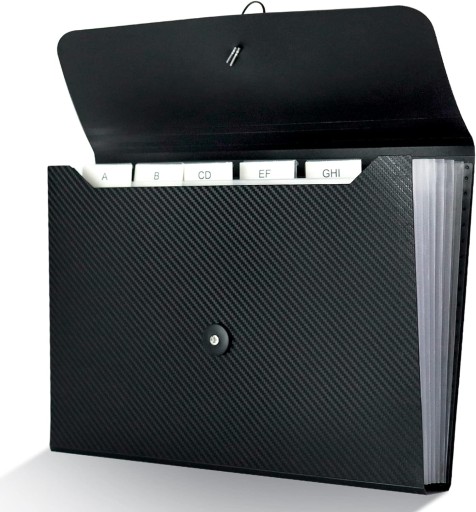 - Wysoka Pojemność: Teczka posiada 13 rozszerzalnych kieszeni, które są w stanie pomieścić od 300 do 500 arkuszy papieru formatu A4.