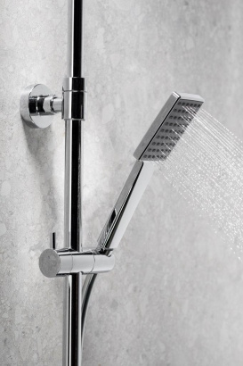 Projekt całości produktu jest spójny – kwadratowy dysk deszczowni idealnie komponuje się z kubicznym kształtem baterii termostatycznej. Co ważne, kształt uchwytów to nie tylko wygląd, to również ergonomia: mamy pewność, że nie wyślizgnie się z mokrej dłoni. Zintegrowany przełącznik natrysku jest wyposażony w blokadę, aby komfortowo korzystać z wybranego trybu – rączki natrysku lub dysku deszczowni.