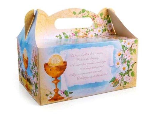 Ozdobne pudełko na ciasto komunijne z kolorowym nadrukiem.Na opakowaniu umieszczona słodka dedykacja.