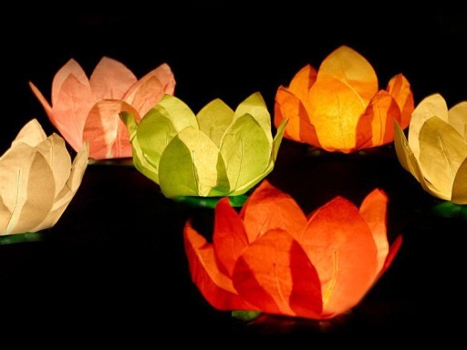 Lampiony papierowe pływające w kształcie kwiatów.