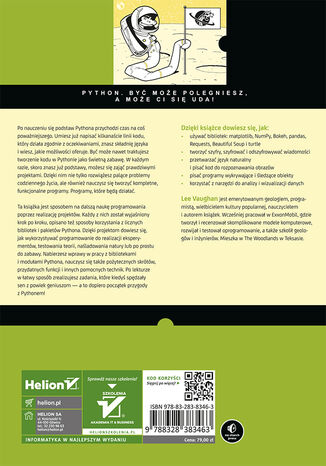 Ta książka jest sposobem na dalszą naukę programowania poprzez realizację projektów. Każdy z nich został wyjaśniony krok po kroku, opisano też sposoby korzystania z licznych bibliotek i pakietów Pythona. Dzięki projektom dowiesz się, jak wykorzystywać programowanie do realizacji eksperymentów, testowania teorii, naśladowania natury lub po prostu do zabawy. Nabierzesz wprawy w pracy z bibliotekami i modułami Pythona, nauczysz się także pożytecznych skrótów, przydatnych funkcji i innych pomocnych technik. W efekcie lektury w łatwy sposób zrealizujesz zadania, które kiedyś spędzały sen z powiek geniuszom - a to dopiero początek przygody z Pythonem!