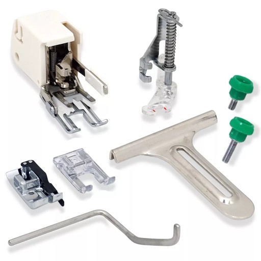 Zestaw pasuje do maszyn Janome i Elna, mających chwytacz rotacyjny, niski uchwyt stopki, szyjących ściegiem o szerokości maksymalnie 7 mm.