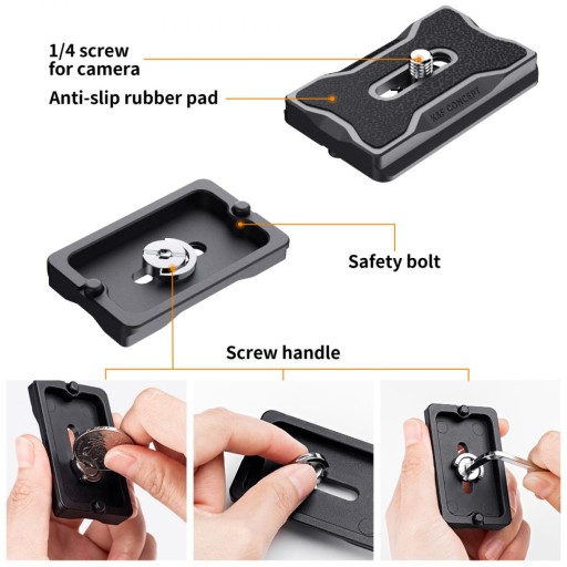 - Szybkozłączka typu ARCA 1/4 cala nadaje się do większości lustrzanek cyfrowych i kamer.