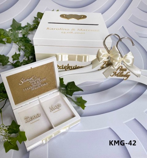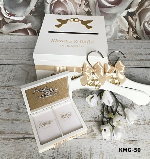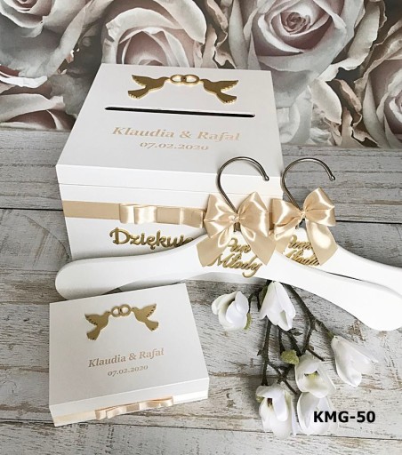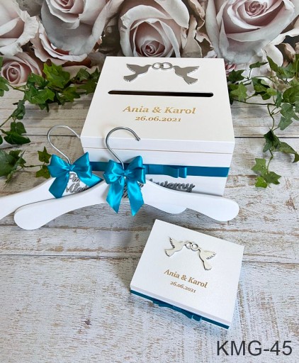 Na zewnątrz pudełka naklejony przestrzenny dekor gołąbki lub serca ( dekor lakierowany w kolorze złotym lub srebrnym) w zależności od wybranego modelu