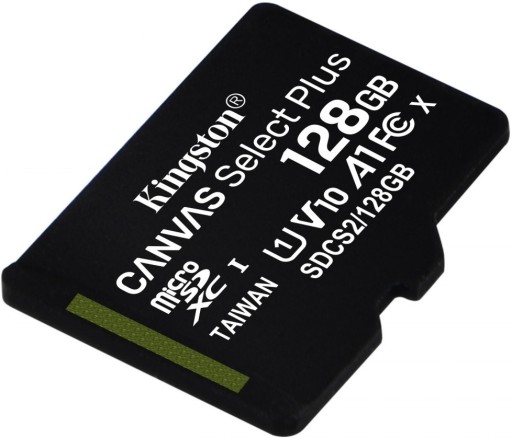 Karta pamięci microSD Canvas Select Plus firmy Kingston jest zgodna z urządzeniami Android i oferuje wydajność klasy A1. Większa szybkość karty i pojemność 128 GB przyspiesza wczytywanie aplikacji i umożliwia zapisywanie zdjęć oraz filmów.