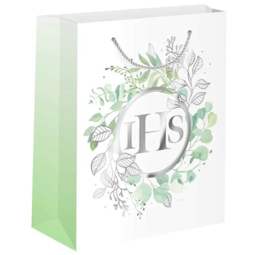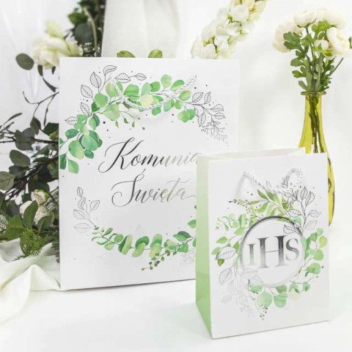 Torebka prezentowa z okazji I Komunii wykonana z papieru, w subtelnej kolorystyce złamanej bieli, zieleni i srebra z pięknym eukaliptusem nawiązującym do wiosny jak i Komunii Świętej. Torebka posiada poręczny uchwyt wykonany ze srebrnego sznurka. Warto zadbać o to by wręczany na Komunię prezent czy upominek był zapakowany w prosty a jednocześnie elegancki sposób.