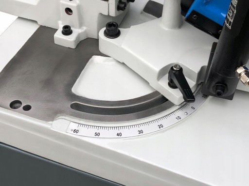 - Możliwość ustawienia ramienia w pionie i używanie maszyny jak pionowej przecinarki taśmowej.