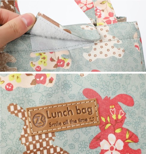 Torebka lunch bag posiada klapkę, w której umieszczony został rzep stanowiący zapięcie torebki.