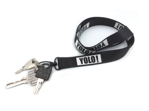 Smycz z nadrukiem z napisem Yolo o szerokości 20mm z metalowym czarnym karabińczykiem do kluczy