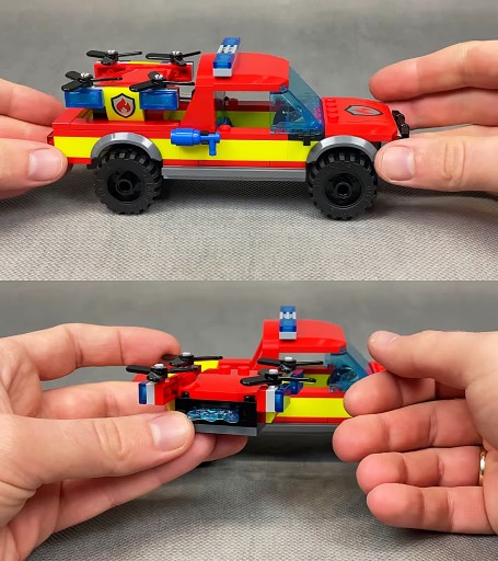 ➡️ Wóz strażacki posiada wiele miejsca na minifigurki, również posiada załączonego drona, który w czasie pożaru wystartuje, aby go ugasić.