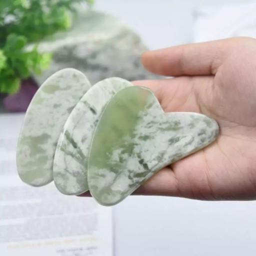 Kamień Gua Sha w kolorze zielonym to masażer do twarzy, wykonany z jadeitu. Materiał ten jest w Azji nazywany kamieniem młodości. Dlaczego? Pozwala skórze zachować młodość, jędrność oraz doskonały wygląd na co dzień. Masaż wyjątkowym kamieniem Gua Sha, który daje widoczne efekty - pozwala zwiększyć krążenie krwi, pobudza dotlenienie naskórka i wyrównuje koloryt cery. Naturalny chłód minerału koi, zmniejsza poranną opuchliznę na twarzy, redukuje nieestetyczne cienie pod oczami i pozwala zamknąć pory skóry. W zaciszu własnego domu masaż możesz jeszcze bardziej uskutecznić poprzez włożenie płytki Gua Sha przed masażem do lodówki nawet na kilkanaście minut. Zalety: - Usprawnia krążenie,