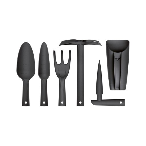 Zestaw 6 plastikowych narzędzi przeznaczonych do różnych prac ogrodowych. W skład zestawu wchodzi : nabieraczka, pazurki, łopatka ogrodnicza, motyczko-pazurki, pikownik, wąska łopatka do niewielkich roślin. Narzędzia wykonane z trwałego tworzywa sztucznego.