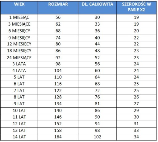 Garnitur dostępny jest w rozmiarach od 56 do 134.