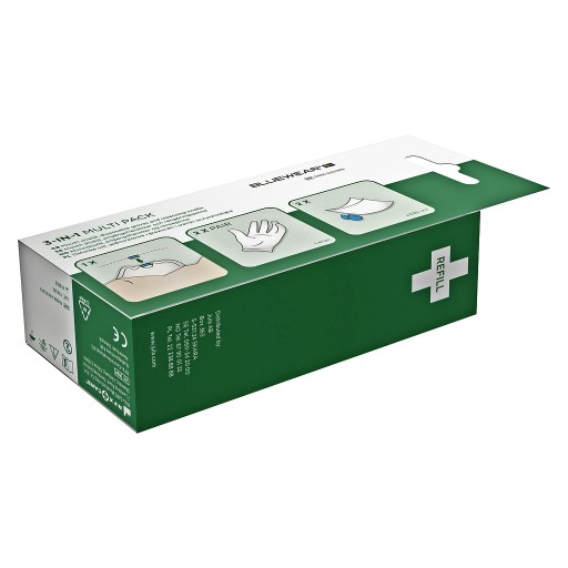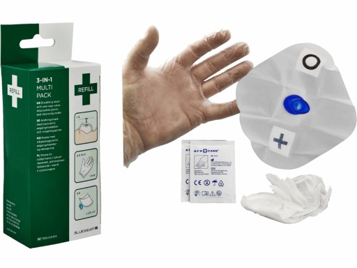 Ten zestaw ochronny marki Bluewear chroni przed bezpośrednim kontaktem z ustami i nosem osoby poszkodowanej podczas wykonywania sztucznego oddychania. Zestaw zawiera maseczkę wykonaną z arkusza tworzywa i wyposażoną w zawór zwrotny oraz rękawice jednorazowe i chusteczki nawilżające. Maseczka jest przeznaczona do użytku jednorazowego.