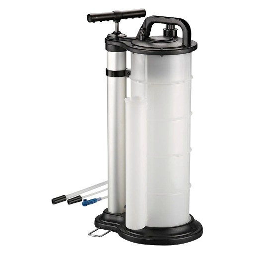 Praktyczne urządzenie do wymiany cieczy z wężem i pompą próżniową, które pomagają np. odpompować resztki oleju z silnika samochodu/łodzi/kosiarki lub wody z akwarium. Ciecz gromadzona jest w zbiorniku o pojemności 9 l. Oprócz standardowego węża 110cm o średnicy zewnętrznej 10 mm zestaw składa się z jednego węża miękkiego i jednego sztywnego Ø6 mm i odpowiednio Ø8 mm wraz z dyszą do złączek płynu hamulcowego. Nie zatwierdzone do użytku z benzyną.