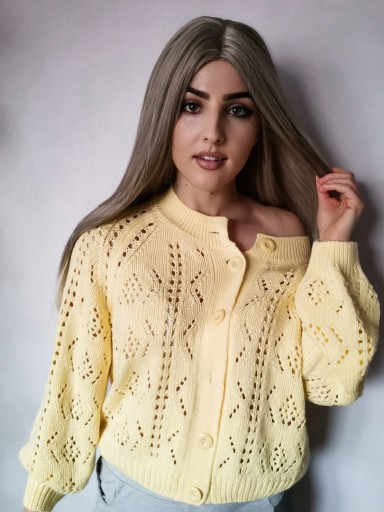Model peruki w kolorze zimnego blondu z białymi końcówkami. Włos syntetyczny. Imitacja przedziałka.