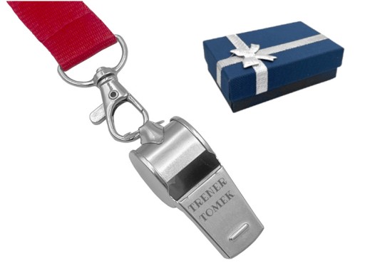 Metalowy gwizdek z dowolnym grawerem. Idealny prezent dla trenera, coacha czy nauczyciela WF-u. Gwizdek zapakowany w ozdobne pudełeczko (kolor dobierany losowo).W zestawie smycz w kolorze czerwonym.