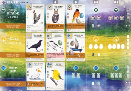 - Złożyć jaja, tzn. pobrać jedno z zasobów i umieścić na karcie odpowiedniego ptaka.